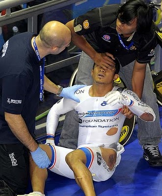 Dalam perlumbaan di Manchester, sekeping kayu sepanjang 20 sentimeter menembusi betisnya.